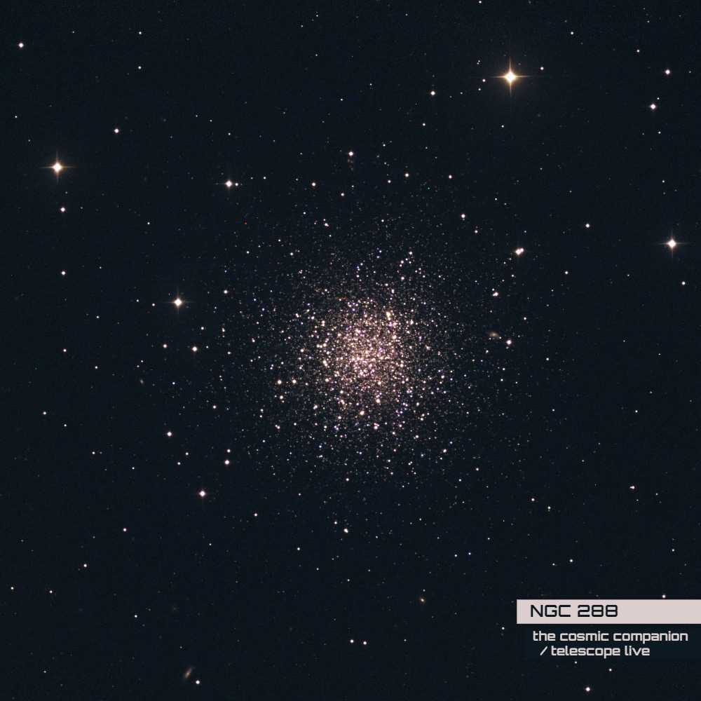 Here’s a new original image of globular cluster NGC 288, recorded over 80 minutes on the night of 1 July, in red, green, and blue wavelengths, using the 60cm CHI-1 telescope in Chile, available from Telescope Live. (Sign up with them using promo code COSMIC for 50% off your first two months of a silver or gold subscription!)