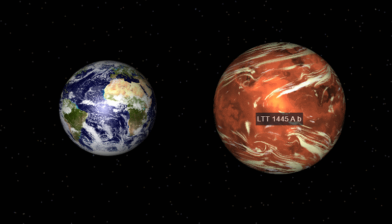 A comparison of the size of LTT 1445 A b compared to Earth. Image created in the NASA Exoplanet Catalog.