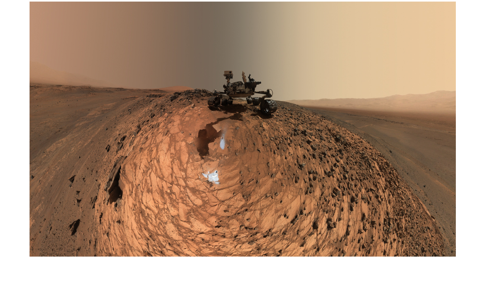 A selfie taken of Curiosity on Mars. This mosaic photo is created from 92 separate images taken by the Martian rover. Image credit: NASA